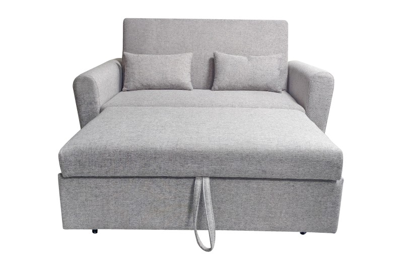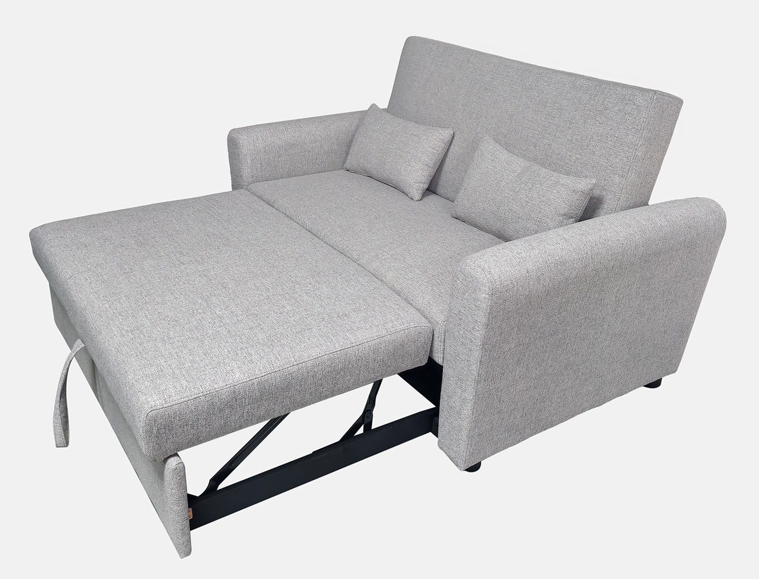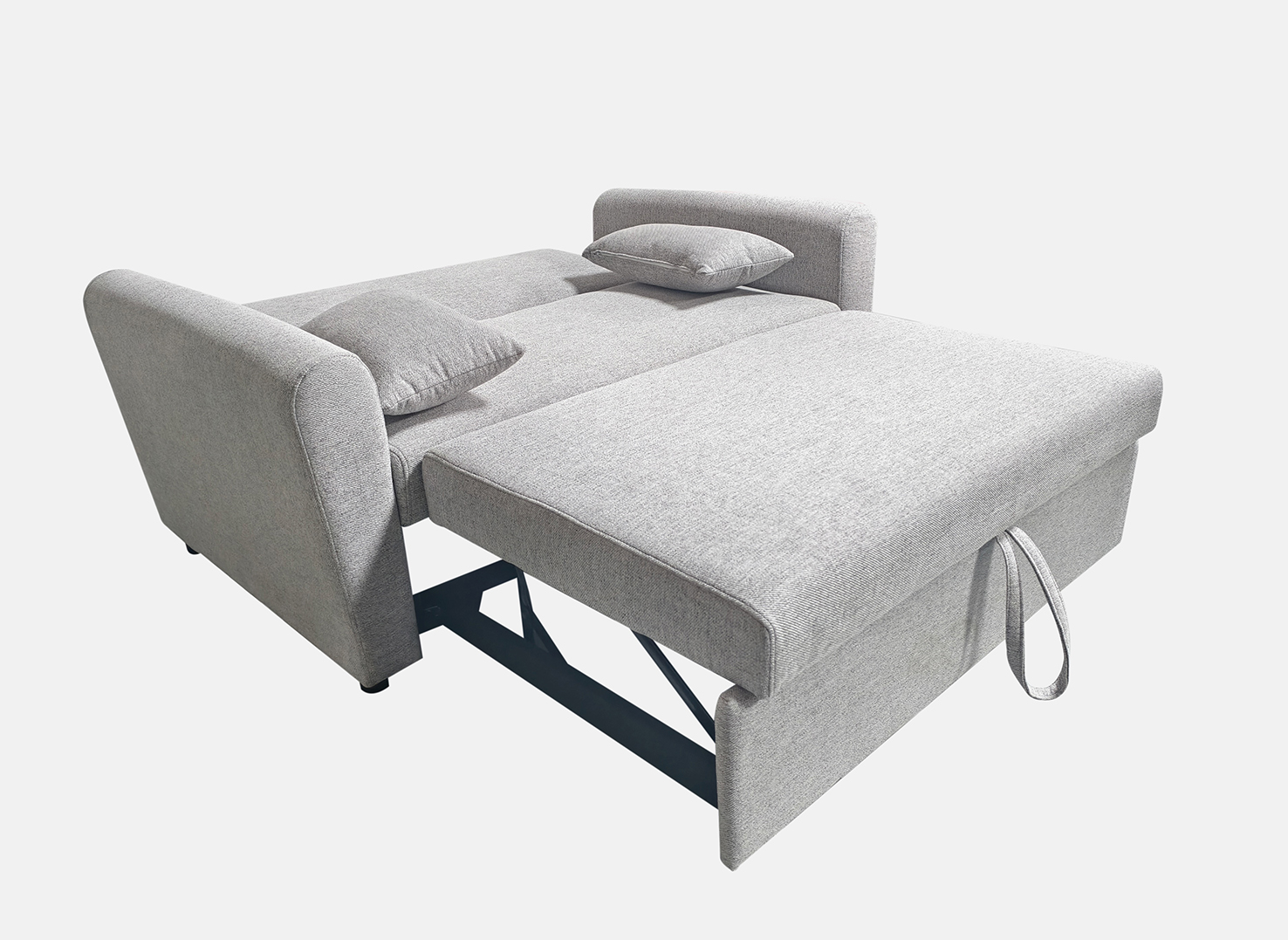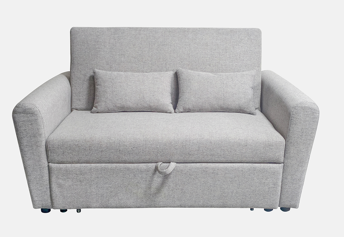 Sofá cama Ciro con brazos y sistema clic clac de apertura rápida. Incluye cama inferior extraíble y dos cojines decorativos. Tapizado en tela Neve gris, combina comodidad, estilo y practicidad para optimizar el espacio.